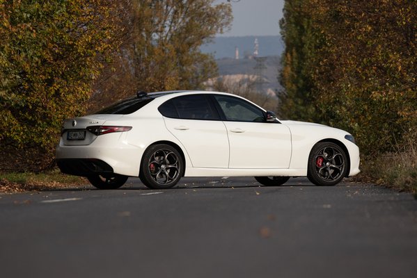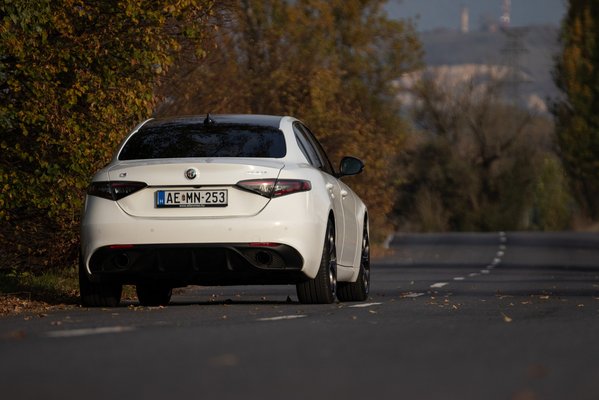 A Giulia a sebességgel arányosan rohamosan javul. Turbós létére a kétliteres négyhengeres kívánja a fordulatot, a teljesítmény egyenletesen épül fel, nem sokkal szabályzás előtt éri el a csúcs 280 lóerőt. Az olcsó villanylóerők korában ez nem is tűnik soknak, de ha az ember képes távol tartani magát a Quadrifoglio tébolyától, a 400 Nm nyomatékkal együtt tökéletes mennyiség – és valószínű, hogy több is az, mint 280. Sokat hozzátesz ehhez, hogy az autó könnyű, az alumínium blokk, futóműalkatrészek és ajtók, plusz a karbon kardán miatt összkerékhajtással is 1600 kiló körül mozog, a 2-2,5 tonnás plug-inek után olyan, mintha a Holdon szerpentinezne az ember.