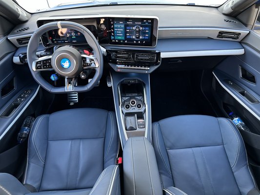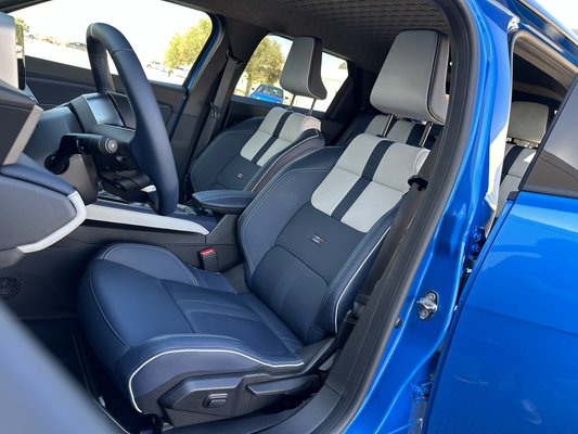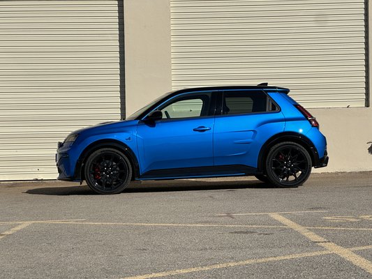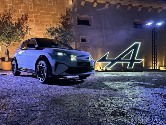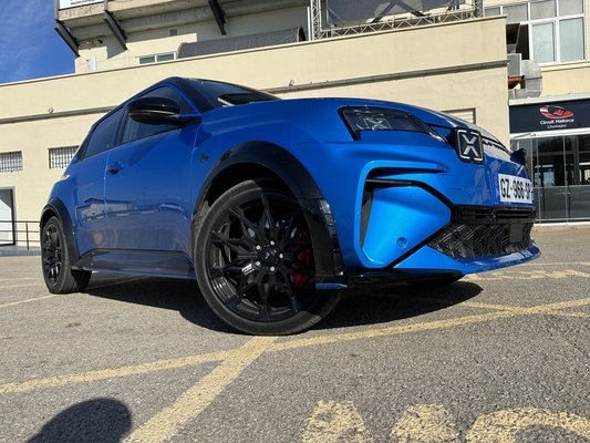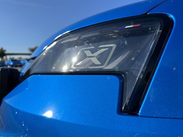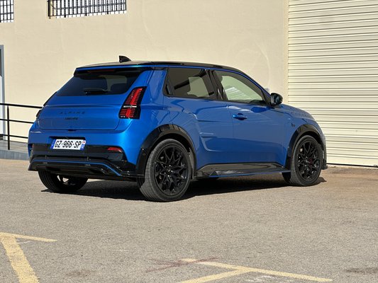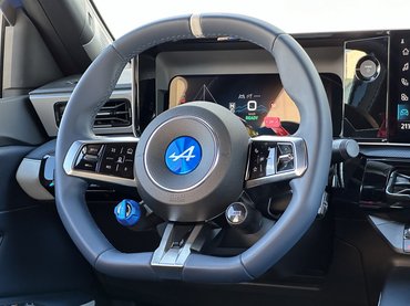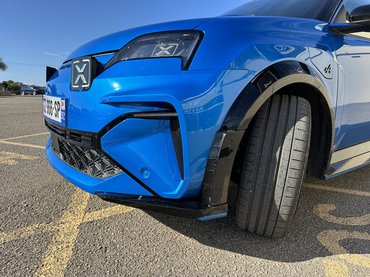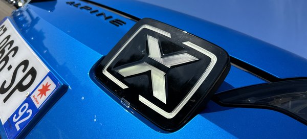 Szembetűnő részlet a szélesítés – főleg a küszöbökön –, a feketével kiemelt sárvédőívek szemből széthúzzák az autó széles mosolyát. Elektromos autóhoz mérten vaskos darab a hűtőmaszk, a reflektorfény itt mégis a világítótesteken van. A fehér LED-del kiemelt X-eket állítólag a rali világa ihlette, az elrendezés pedig az újjáélesztett Alpine első önálló modelljéről, az A110-ről jön, csak ott nem téglalapok, hanem körök vannak.