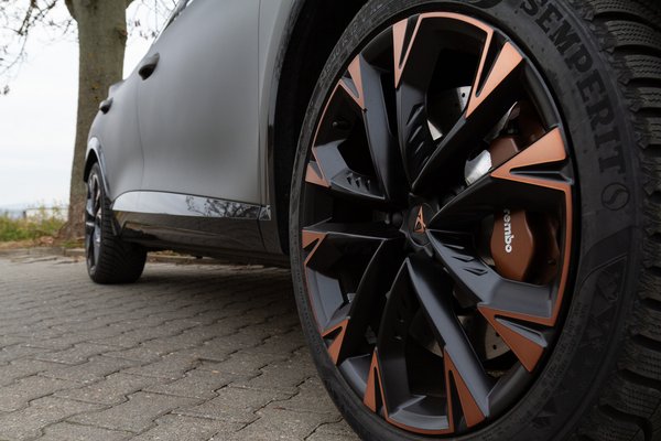 Rengeteg a bronz bevonat, hiszen ez a Cupra színe, még a négydugattyús féknyergek is ilyet kapnak. Ha csak oldalról látod, meg lehet mondani, milyen hajtás dolgozik benne, mert a PHEV Brembo, az erősebb benzinesek pedig Akebono monoblock nyergeket kapnak. Hogy miért a különbség, nem tisztázta még a gyártó, de tippre az utóbbi nagyobb igénybevételt bír, azok voltak a már nem készülő öthengeres VZ5-ön is.