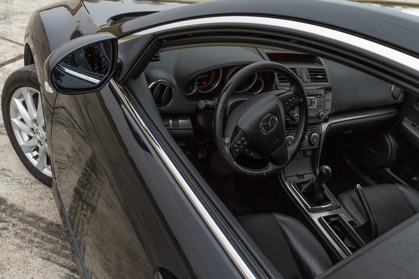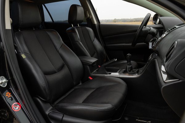 Alapvetően nagyon jó állapotban maradt fenn a Mazda6 utastér, az üléseinek tömése újszerű és a bőr-szövet kárpit is szinte teljesen hibátlan mindkét sorban. Főként a kezelőszerveken látszik a használat és sajnos elég jelentősen. A kormány és a váltógomb bőrözése teljesen elhasználódott, és ilyet már láttam, annyira vékony és puha lehet a bőr, hogy egyszerűen elkopik.