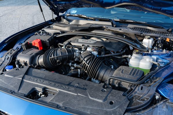 Az 1,2 millióba kerülő Ford-General Motors közös fejlesztésű tízfokozatú szerkezet egész jól működik, intenzív gyorsításnál is szépen kapcsolgatja a fokozatokat, mégis észrevehető egy kis ráhagyás az 1836 kilós karosszéria mozgatásában, ami nagy részben a váltón múlik. Aki a mindennapokra keres autót, nem jár rosszul a kemény kuplung hiányával, és ha kell a jobb reakcióidő, még mindig bevetheti a műanyagos váltófüleket, de aki hobbiautóként tekint rá, annak az igaz út az alapáron járó, Getrag-féle hatfokozatú kézi váltó. A Dark Horse egyébként Tremec váltóval készül.