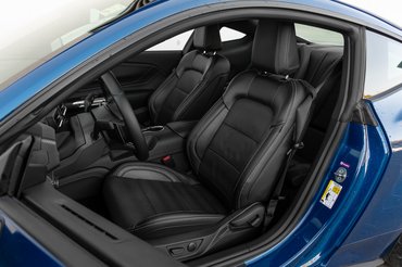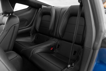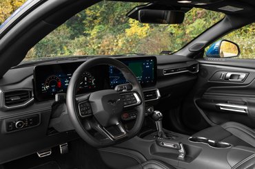 Messziről látszik, hogy a nagy nyomás ellenére szívből tervezték, a szenvedélyről árulkodó részleteket viszont csak közelről lehet észrevenni. Van egy musztáng a fényszórók szélén, a szélvédő tövében és a műszerfal oldalán is, az egyetlen Ford emblémát a szélvédőn találjuk. Akinek éles a szeme, észreveheti az eddigi generációk sziluettjét a hátsó ablak alján, és egy meglepetéssel azoknak is készültek, akik ennél retrósabb műszerfalra számítottak. Ugyanis a Mustang is megkapta a legújabb fedélzeti rendszert és belső elrendezési logikát, ami egy hajlított kijelzőt is hozott.