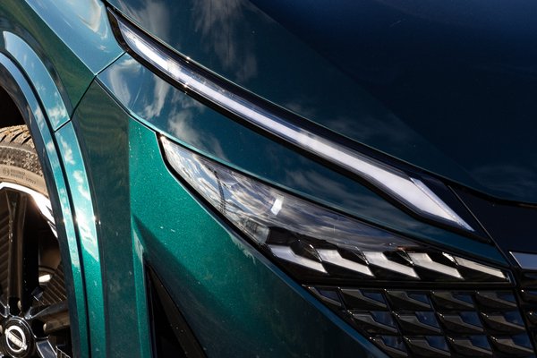Akárcsak az aprólékosan összerakott új hűtőmaszk, ami szintén sérülékeny, hamar és nehezen moshatóan koszolódik, mégis jól tud állni a Qashqainak. Miatta ketté osztották a korábban C alakban összeérő fényszórókat is. Látványos, csak kicsit az Omoda 5-öt juttatja eszembe, vagyis hiába az európai (brit) tervezés, meglehetősen ázsiai a hatás. Az új lámpák felső része nappali menetfény és irányjelző, az alsók a főfényszórók, ebben az esetben pont az új adaptív, kitakargatós egységek.