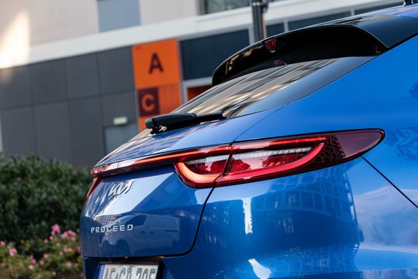 Ez persze nem jelenti azt, hogy ne lennének a Proceeden jópofa és igényes részletek. Nagyon tetszik, ahogy az első lökhárító oldalsó légbeömlői felül folytatódnak a kerékjáratokig, király a fényszórókba rejtett három fénylő ív, és hátul, a kipufogók között végigfutó két piros csík is kellemesen feldobja az összképet. Talán ez a Proceed visszafogott, de mégis elegánsan sportos megjelenésének titka: a nagyobb elemek nem túlzóak, de az apróbb részletek mégis hozzáadnak egy kis izgalmat az összképhez.
