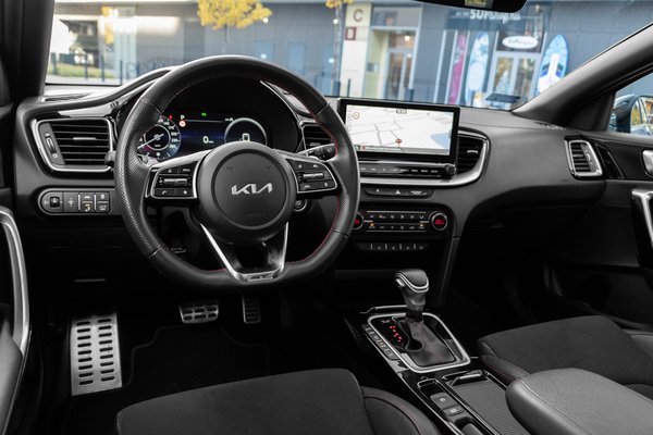 A Proceednél tökéletesen ez történt. Az utastérben minden logikus, átlátható és ismerős, még azok számára is, akik életükben nem vezettek Kiát. Egyetlen helyen nyúltak a mérnökök újabb megoldáshoz, ami a beltér leggyengébb megoldása is lett egyben: a közvetlenül az infotainment kijelző alatt húzódó gombsor valójában homorú érintőpanelek sorozata. Ezeket használni mindig, mindenhol bizonytalan élmény: csak akkor derül ki, sikerült-e megfelelően megnyomni a kiszemelt gombot, ha rövid késés után a kijelző reagál – vagy nem.