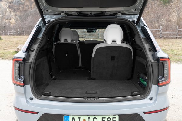 Elfér benne a hátsó roló és a töltőkábel, amit mégis inkább a motorháztetőt alatti 37 literes tárolóba érdemes tenni. Sokan felhúzzák a szemöldöküket, hogy a kesztyűtartót a menüből lehet nyitni, és azon is mindenki meglepődik, hogy az ajtóbehúzón van a kilincs. A méretei nem hiába túlzók, belül is tágas a hely, a második és a harmadik sorban is tartják a testet az ülések. Elférnek a fejek, a vállak és a térdek, csak a hátulra beülés nem a legkényelmesebb, de ez minden hasonló autónál, például a Kia EV9-nél is egy létező probléma, a Volvóban a biztonságérzet kárpótol érte.