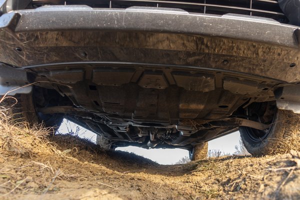 Masszív merevhidak és kitámasztó karok helyett elöl MacPherson, hátul pedig Multilink rendszerű futómű van, ami a hétköznapokban sokkal stabilabb és kényelmesebb, cserébe terepen nem olyan rugalmas. A közel 4,7 méteres test nem nyikorog amikor csak egy kerékkel mész fel a buckára és a hegyoldalon lefelé ereszkedve sem ad ki furcsa zajokat – a szerkezeti merevség példás. Emiatt a beltér sem ropog, a műanyagok mind a helyükön vannak és valószínűleg évek múltán sem másznak el.