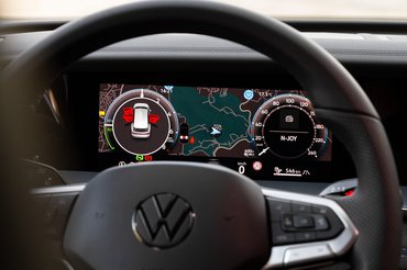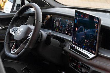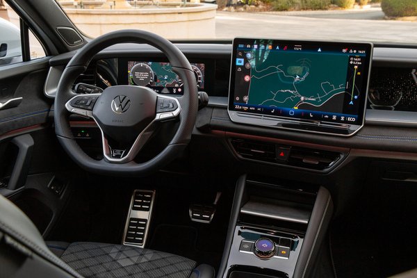 A zajcsillapításon biztos nem, mert a háromrétegű, 5 milliméter vastag üvegek mögött kimondottan csendes az utastér (a Tiguanhoz képest -4 dB), egyedül a dízelek kerregése szűrődik be valamelyest. A felhasznált anyagokra is figyeltek, valódi fa és szövetborítás, valamint hátulról megvilágított díszpanelek igyekeznek növeli a prémiumérzetet. Elérhető HUD, ChatGPT alapú hangvezérlés – ami funkciókat tekintve továbbra is korlátozott –, elöl két, vezeték nélküli, hűtött telefontöltőpad, hűthető-fűthető masszázsülések, HD Matrix fényszórók, a hátsó ablakokon árnyékoló, hátul pedig tablettartós kartámasz, ezek alapján tényleg érezni, hogy nem sokkal a Touareg alatt járunk.