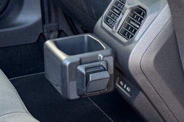 Elöl középre emeltek egy hatalmas idomot, ami először tetszett, aztán kiderült, mennyi hasznos helyet pazaroltak el vele. Kellett valami nagyautós részlet a Dustertől eltérően, és ezt sikerült. Magasabbaknak a térdük sem férhet el tőle rendesen, de hozzáteszem, 180 centis magasságommal nekem ilyen problémám nem volt. Zárható fedeles könyöklőt, pohártartót és indukciós telefon töltő padot építettek rá, utóbbit egy kis fészekbe, gumírozott padlóval.