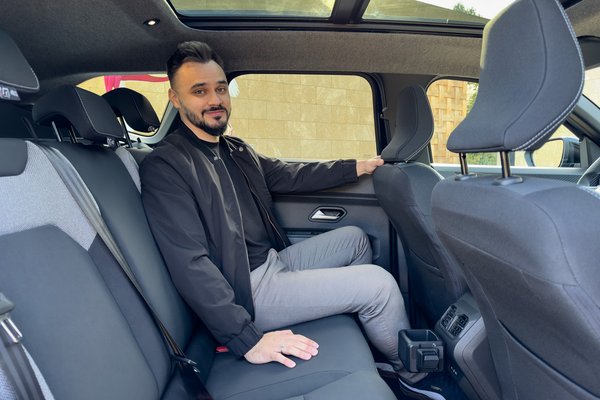 Hátul kimondottan nagy a hely, a rám beállított vezetőülés mögött marad még vagy 15 centi a térdeimnek. Jól ülök, ebben mondjuk nincs semmi különös, miután az ülés tömése elég átlagos és ebben középső könyöklő sincs, de van olyan változat. Különös az ülés kárpitozása, a vízhatlan cipők anyaga jut eszembe róla, rettentően szintetikus hatása van, cserébe biztosan könnyen takarítható.