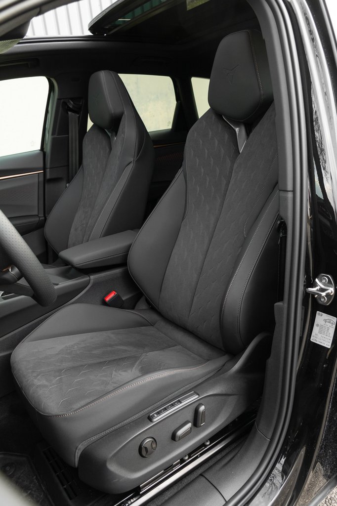 Egy tömbből faragott SUV-t látunk szokatlan arányok, megdöbbentő törések és hajlítások nélkül. A feketében kevésbé jól érvényesülő, de szépnek bátran nevezhető formát izgalmas részletek dobják fel. A háromszög alakú LED szegmensekről felismerhető lámpák, az óriási, látványosan áttört, mégsem hivalkodó hűtőmaszk, a hátul pirosan világító Cupra logóban egyesített LED lámpák, a lökhárítók visszafogott betétei és persze a különleges felnik úgy emelik ki a többi, hasonló technikájú rokona közül, hogy közben akár még elegánsnak is nevezhetjük. Régen láttunk ilyen harmonikus sportmodellt!