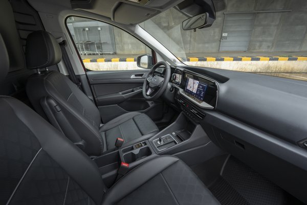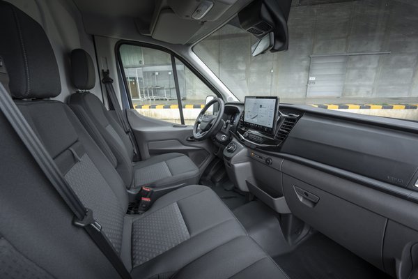A kormány mögé huppanva egy letisztult, átlátható belső fogad minket. A digitális műszeregység mellett egy tökéletes méretű infotainment kijelzőt találunk, amin egy kellemes megjelenésű szoftver fut. Fizikai gombok hiányában a funkciók nagy részét ezen keresztül érhetjük el - igaz, a kormányról rengeteg minden állítható -, de szerencsére a leggyakrabban használt opciókat (mint a klímavezérlés) egy mindig elérhető tálca rejti a képernyő alján. Mindenképp érdemes még megemlíteni a meglepően kényelmes vezetőülést is, amivel erős kontrasztban áll az opcionális, felhajtható anyósülés. Utóbbi különösen hosszú szállítmányok esetén jöhet jól, amik a válaszfal nyílásán át benyúlnak az utastérbe. Bár az opció kétségtelenül hasznos, maga a felhajtható ülés nagyságrendekkel kényelmetlenebb a vezetőülésnél.