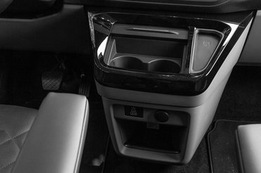 Nyolcszemélyes kivitelben elöl középen nincs semmi, ez egy kicsit pazarlónak tűnik. Gyerekként biztos élvezném, ha a szülők között itt mászkálhatnék, de most inkább hiányzik onnan valami tároló, vagy plusz ülés, bármi. Annyira széles az utastér elöl, hogy a két ülés két-két lehajtható karfát kapott, mert az ablakig már nem ér el kényelmesen a könyököm. Több értelemben is rettentő praktikus a kialakítás, kezdve a műszerfal két zárható kesztyűtartójával, a rolós fedéllel zárható pohártartókkal, vagy a nagy polccal a pult tetején.