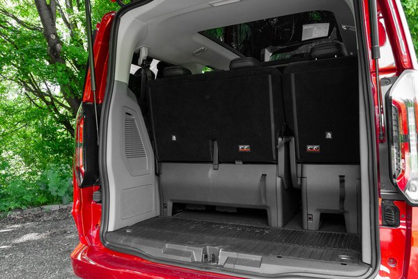 Hátulról indulva a felfelé nyíló csomagtér mögött 797 literes raktér tárul fel, ha a hátsó ülések teljesen hátra vannak tolva, és ez csak a rövid verzió, a nyújtottban 923 liter a legkisebb raktér. Igényes szövetkárpit borítja az egész padlót, és minden ülés síneken tologatható tetszőleges állásokba. Szembe is lehet fordítani a második sort a harmadikkal, ami üzleti utaknál és családi kirándulásoknál is hasznos, már ha van a csapatban olyan, aki bírja a hátrafelé utazást. USB-C csatlakozó jut majdnem minden főre, ami elég nagy szó, Isofix viszont nincs minden ülésen.