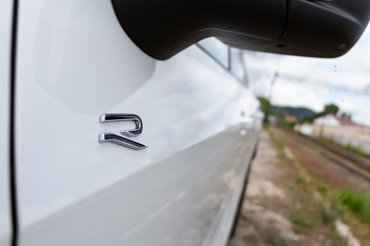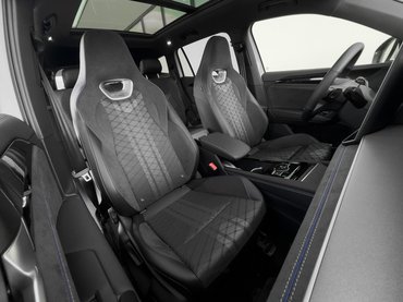 R-Line kivitelével a sportosabb külső mellé bent is megjelennek olyan anyagok, mint az Alcantara. Ezzel borítják a műszerfal és az ajtók díszbetéteit, kifejezetten jól áll a formáiban és anyagaiban egyéb helyeken egészen semleges bendőnek. Ez a letisztult középkonzol ügyes megoldás, hatalmas tárolót találok a könyöklö alatt, bár a pohártartókat épp az alá helyezték, ami nem túl logikus.