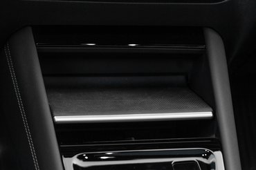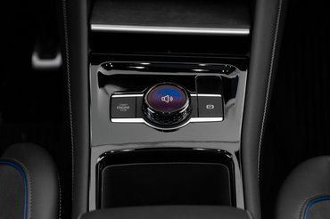 Első felén mozgatható polc alatt kettő darab telefon töltőpadot találunk, a kettő között pedig nem váltó kart, hanem egy tekerő gombot változtatható funkciókkal. Lehet hangerőt, menetmódot, vagy hangulatot változtatni vele, okos megoldás, de a pozíciója miatt elég kényes. Ebbe itt épp beleöntöttek valamit előttem, és napokig fémes csiszatolással tudtam csak tekergetni, aztán elmúlt. Ezzel együtt összesen háromféleképpen lehet hangerőt változtatni, ott van még az érintő csúszka a kijelző alatt és a kormány valódi gombjai.