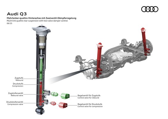 Izgi, de a Q3 nem erről szól, főleg azoknak, akik megveszik majd. Ez egy kiváló méretű családi autó, tehát legyen tágas, kényelmes és biztonságos. Az első tétel pipa, a kényelem pedig nem csak a beltér oldaláról jár az autóhoz. Az új Q3-ban elérhető egy adaptív csillapító rendszer, amely kétkamerás gátlókat és egy rendkívül gyors számítógépet használ. Nemcsak a terepviszonyokhoz alkalmazkodik, de a vezetési stílusunkat is leköveti. Fékezésnél is, gyorsításnál is képes feszíteni a gátlókon, így kisebbet billen a karosszéria, ami jó egy ilyen magasabb építésű SUV-nál.