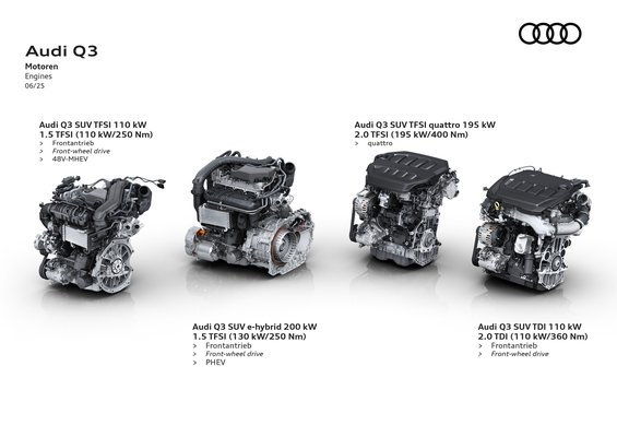 Csoporton belül kicsi a mozgástér, így nem is mutattak semmi extrát a hajtásláncok terén. Elővették a klasszikus Volkswagen-rendszereket, amiket a csoport minden tagja nagyjából pontosan ugyanazokkal az adatokkal használ, legfeljebb kissé eltérő hangolással. A belépő szintet az 1,5 literes mild hibrid TFSI motor jelenti, ami 150 lóerővel elég szomorúan mozgathatja a Q3-at, de legalább le tudja kapcsolni menet közben a kettes és hármas hengert, ha nem kell érdemi teljesítmény – biztos jól fogyaszt.