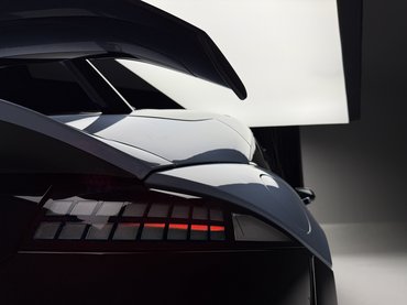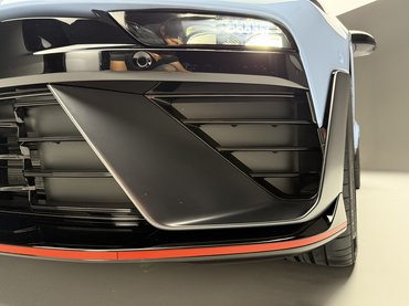 Az autó orra nagyon durva, már-már modernebb Lamborghinik elejére emlékeztet a hűtőlamellák és terelőlemezek együttese, de nagyban rájátszanak a fényezéssel. Ahogy az N-kék felső rész ráfolyik a fekete alapokra – amiket alulról egy piros csík választ el az utca porától – az drasztikusan megemeli az autó orrát. Azt hinnénk, hogy csak úgy dől bele a rengeteg hűtőlevegő, valójában a nyílások jelentős százaléka vak, hiszen az elektromos rendszernek nincs olyan hőterhelése, mint egy combosabb belső égésű motornak. Azonban dizájnban ezt szoktuk meg, ezt gondoljuk agresszívnek, vagánynak és végeredményben működik.