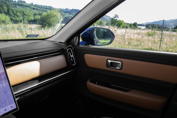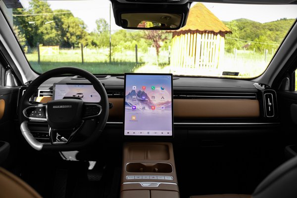 A külsővel erős ellentétben áll a világos, letisztult utastér. A karamell barna kárpit meglepően hangulatos, már-már prémium összhangot alkot a fekete és fémszínű betétekkel, az elegáns megjelenéshez pedig az egyszerű formák és a sallangmentes dizájn is hozzájárul. Minőségérzet terén sem lehet ok a panaszra. Bár itt-ott akadnak kopogós műanyagok, a legtöbb felület tetszetős és jó tapintású. Ugyanez az infotainment rendszerre is igaz, ami remekül passzol az utastér hangulatához. A hatalmas, 14,8 colos központi kijelzőn jól mutat a világos, átlátható menürendszer, amivel azért akadnak kisebb gondok.