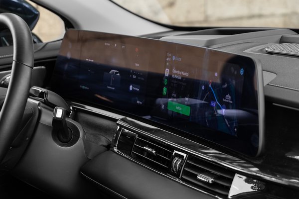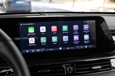 Sokszor a kijelzők határolják be a kormány helyzetét, és itt sincs ez másként, muszáj magasan lennie a kormánynak, ha látni szeretném a műszerblokkot. A két kijelző beépítése és képe szép, kellő mennyiségű információt kapok magam elé, de a rendszer logikáját még szokni kell. Akárcsak a multimédiáét, amin teljes képernyőn jelenik meg a CarPlay, amint párosítottuk, és vagy kilépünk belőle, vagy felhúzzuk az alsó sávot, ha a szellőzést akarjuk állítani.