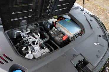 Ezt az elektromostól elvették, mert egyrészt nincs rá szüksége, másrészt így könnyen megkülönböztethető. Ízlés kérdése, én nem szeretem, ha egy autó láthatóan elektromos, ha van belőle sima változat is, ilyenkor kicsit mindig azt érzem, hogy valamit lehagytak róla. Annyival azért trükköztek, hogy a töltőnyílást az orra hegyére helyezték és bentről gombbal nyitható, felpattan, mint egy rendes fedél, visszacsukni viszont már kézzel kell.
