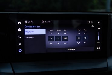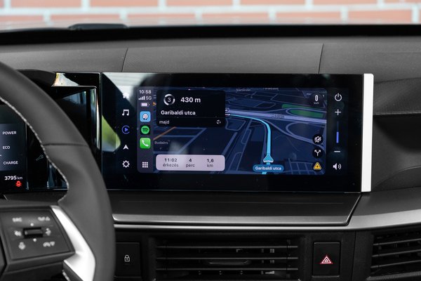 Alapáron nincs középső kijelző - láttunk már erre példát - csak egy telefontartó és a letölthető applikáció, amivel egy minimális multimédia kezelőfelületet kapunk a telefonunkra. Működik róla a hifi, mert Bluetooth és hangszórók ebben is vannak, a klímakonzol pedig mindenképp fizikai, ennek is lehet örülni. Egy szinttel feljebb érkezik a 10,25 colos monitor középre elég jó képminőséggel és vezeték nélküli CarPlayjel meg Android Autóval, használni tökéletes.