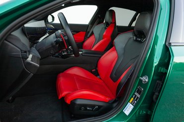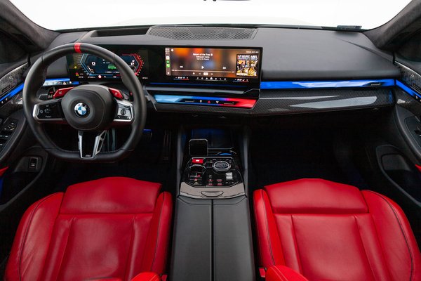 Szerencsére belül szerény, mint az ibolya. Csak viccelek, hogy lenne már az: ami bőrből van, az piros, ami nem, az színesen világít. Úgy prémium, ahogy azt manapság szokás: a júzert gigantikus kijelzők veszik körbe, nyomasztó mennyiségű a szénszál, a légbefúvás irányát szervomotorok intézik, a hosszú, ajtókra forduló dekorbetétek alatt diszkrét mintán keresztül világít az RGB. Ha a hagyományosabb, analóg megközelítést kedveled, akkor az M5 túlságosan Gen Z.