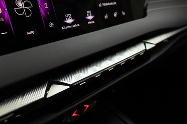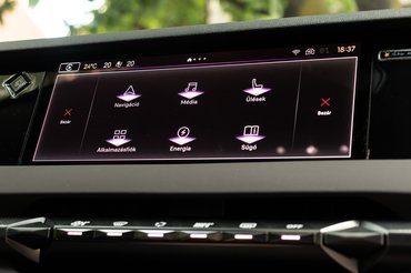 A klímapanel megmaradt fizikai részébe integrálták a középső szellőzőket, az érdes felüeltű háromszögek élén pedig világító gombok szolgálják az alapfunkciókat. A többit a kijelzőn intézed és pont olyan idegesítő, mint amilyennek gondolod. Még úgy is, hogy ez a Stellantis szoftverének már sokadik változata és nem akadozik, nem lassú, csupán viszonylag sok szokást igényel. Nem véletlenül került fel végső menekülés gyanánt egy home gomb a kijelző bal szélére – természetesen az is rombusz.