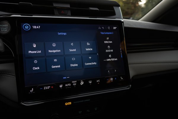 Természetesen vannak olyan dolgok is, amiket a negatívumok oldalán is meg kell említenünk, a 12 colos központi ugyan jó minőségű, de a Sync 4 rendszer ugyan ad egy jól működő telefontükrözést és bőséges egyéb funkcionalitást is, de még mindig nincs benne magyar nyelvű felület, és a rendszersebesség is maximum közepes.