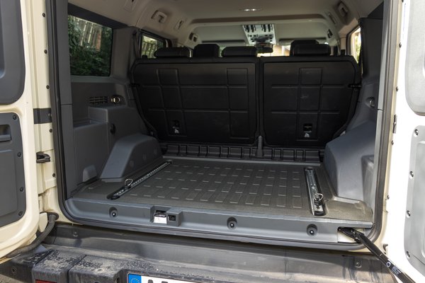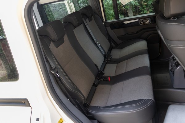 A szélvédő majdnem teljesen sík, talán csak a szélein látok némi visszafogott görbületet és alap esetben ez rendkívül szűk érzetet nyújtana egy utastérben, azonban a Grenadier baromi nagy. A tengelytáv alulról karcolja a három métert, a teljes hossz pedig a kis túlnyúlások ellenére is az ötöt. Széltében még tükrök nélkül is megvan az 1,93, magasságra pedig két méter – örülök, ha átlátok a motorháztető felett. Ilyen dimenziók mellett még a vaskos idomokkal együtt is sikerült tágas belteret varázsolni a Grendaierbe, pedig mindent megtettek, hogy ne így legyen.
