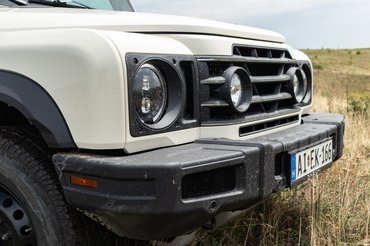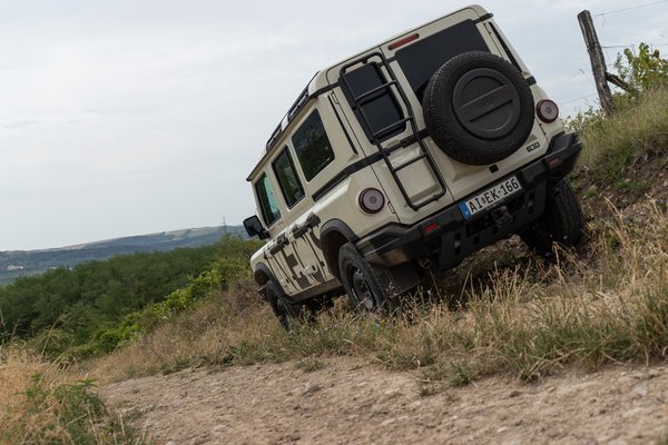 A másik nagyon érdekes megoldás, hogy az Ineosnál szokatlanul nagy kormányáttétellel dolgoznak: a két végállás között majdnem négyet kell tekerni a kormánykeréken, ezáltal sokkal lassabban viselkedik azonos mozdulatokra, mint egy hagyományos személyautóban. Gyors manőverekre abszolút nem alkalmas, de el tudom képzelni, hogy akkor is felkapatod a kereket a bakhátra, ha valamiért elhagyja magát a szervó. A golyópályás kormányművet nem hatják meg az egyenetlen terepviszonyok, a köves úton is úgy repül át a Grenadier, hogy a kormány legfeljebb rezeg, de még véletlenül sem dobál. Egyedül lejtőn lefelé éreztem komolyabb ellenállást, de még akkor sem akart az autó alá fordulni a kerék, amikor a súlyának jelentős része a kormányzott tengelyre ereszkedett.
