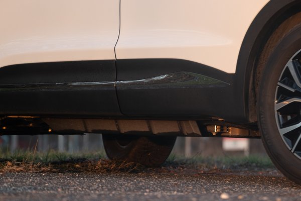 A magas építés azonban nem jelent automatikusan nagy hasmagasságot, a Tiggo 7 alja elméletileg csak bő 15 centire van a földtől, azonban nem tiszta, hogy ezt a Chery honnan méri. A fotózásnál vettem észre, hogy látványosan a küszöbök vonala alá lóg egy vaskos fémszerkezet, ami a kiállított hajtáslánc modellek alapján az akkumulátor. Józan paraszti ésszel azt gondolnám, hogy akár csak egy üzemanyagtank, ott nincs jó helyen, bármikor megsérülhet. A Chery azonban külön büszke arra, hogy a 18,3 kWh-s LFP akkumulátor rendkívül ellenálló. Napokig tesztelték sós vízbe merítve, bő 20 tonnával terhelték és különböző körülmények között kínozták a csomagot, amivel ha mégis bármi baj történik, egy rendszer 0,002 másodperc alatt (2 ms) lekapcsolja az autóról.