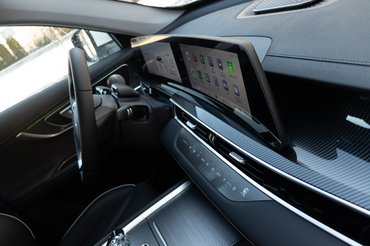A könyöklő előtti panel a kristályüveg váltóval kissé bazári de nekem még belefér, felette azonban van egy matt felületű érintőpanel a klímához. A dizájn nagyon ütős, a Nissan Ariyában is szeretem ezt a megoldást, azonban nem érzékel olyan finoman, gyakran mellémegy a beütni kívánt parancs, vagy éppen erőből kell rátehénkedni a műgombokra és ezt csak tovább rontja a lassú és körülményes fedélzeti rendszer. Minden funkciónak vannak animációi – a klímavezérlő érintésre felúszik a képernyő aljáról – ám ez idő és a kijelző addig sem reagál semmire. A fentről lehúzható vezérlőközpont dettó és néha ez a panel is csak az erőből értett – vagy egyszerűen csak lassan reagált én pedig a türelmetlenségemet plusz erőbefektetéssel kompenzáltam. Voltak funkciók, amiket halálra kerestem, majd újraindításnál visszaállította az autót, de ez valószínűleg nem az ő hibája, inkább valami korpás bajszú, EU-s politikus lázálma egy biztonságosabbnak gondolt jövő felé vezető úton.