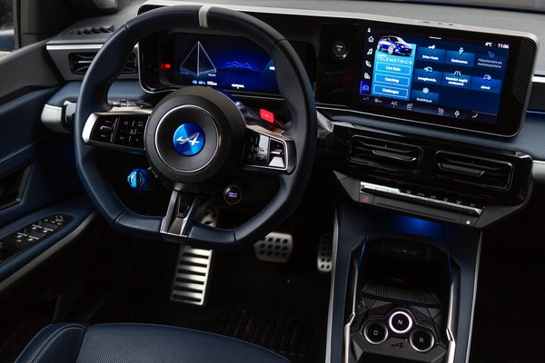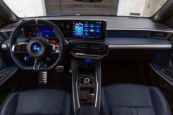 Belül két kényelmes és tisztes oldaltartású ülésből indul ki az élmény. A menetválasztó bajuszkart lecserélték az Alpine-féle gombos megoldásra, a menürendszer tele van mindenféle sportfunkcióval a guminyomástól elkezdve a köridőn át a virtuális telemetriáig, van OV-gomb, ami arcade játékokat idéző módon extra teljesítményt ad az előzésekhez és egy kék forgókapcsoló a regeneratív fékezés állításához. Természetesen az alapfunkciók és az Android 12 alapjaira épülő operációs rendszer főbb elemei nem változtak meg a testvérmodellhez képest. Megvan a kábel nélküli CarPlay és Android Auto telefontükrözés, vezeték nélküli telefontöltővel, de USB-C csatlakozóból is kettő jutott előre.