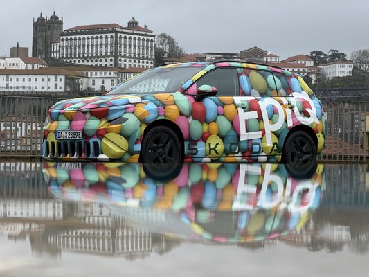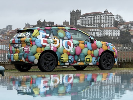 Cukorkafóliába csomagolt tesztautók sorakoztak Porto legrégebbi borászatának teraszán, a háttérben a Duoro fölé tornyosuló óváros. Az időjárás szürkés, így éles kontrasztot ad a színes fólia alá rejtett Epiq sziluettjének. Látom, mi van az álca alatt, nem számítok nagy meglepetésre, főleg, hogy a koncepciót már tavaly szeptemberben leleplezték. Azonban kedves összecsengése a márkának és a helyszínválasztásnak, hogy míg Porto legrégebbi borászatát egy német ember alapította, addig a Skoda évtizedekkel ezelőtti felemelkedése is a germánokhoz köthető.