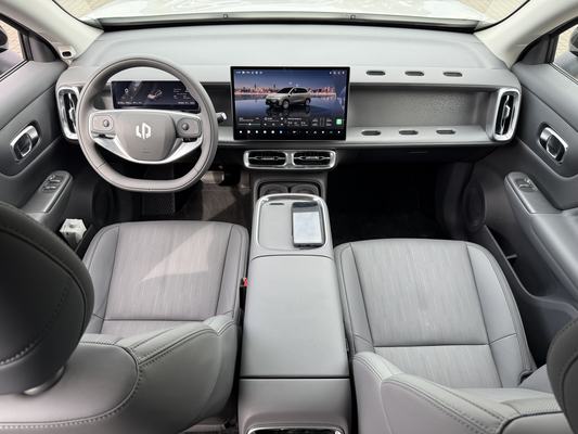 Mégsem érezni a francia vállalat presszióját, viszont azt is látni kell, hogy ők a kínai ízlésvilág alapján dolgoznak, illetve szem előtt tartják az olcsó és könnyű gyárthatóságot. Ez egyértelműen látszik a műszerfalon, amin a főszerep egy nagy kijelzőé, mellékszerepben pedig egy kisebb tábla világít a kormány mögött. Ezen túl csak néhány jópofa de funkció nélküli alakzat próbálja némi egyediséggel felruházni a B10 utasterét, de képtelen volt bármilyen érzelmet is kicsikarni belőlem. Eleve lassan tudom lekövetni a tendenciát, amiben minden funkciót a központi kijelzőre integrálnak, pedig a Leapmotor ezen az úton jár, sőt, agresszívan másolja a Teslát. A multikormány kialakítása, az almenük elrendezése és a funkciók elhelyezése mind az amerikai vállalat alaposan kidolgozott megoldásait idézi, azonban pont mint a rosszul lemásolt házi feladatnál, itt is vannak kisebb hibák.