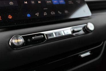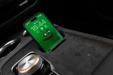 Aztán ott az indukciós töltő, ami szükség esetén velúr-hatású borítással védi korunk méregdrága telefonjait az eltávolíthatatlan karcoktól. Ha nincs rá szükség, akkor egy ferde telefontartó kínál megoldást, amin bár látszik a kijelző fontosabbik fele, de van felette egy 12,8 colos kijelző is, ami lényegében válasz minden általunk keresett funkcióra. Nyilván megértem, ha valaki menet közben ezen nem szívesen tapicskol, ezen emberek az MG felé is jelezték aggályaikat, a gyártó pedig haptákba vágta magát és reagált. Egyszerű, de átgondolt kezelőpanelt terveztek a szellőzők fölé a legalapvetőbb klímafunkciókkal és egy home gombbal – ami minden helyzetben visszadob a rajtvonalra. Ez nemcsak megkönnyíti a menürendszer kezelését, de rendkívül igényes részlete az egyszerű felépítésű műszerfalnak.