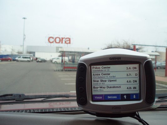 Bevásárlóközpontok terén is van egy kis lemaradás. Már csak a vicc kedvéért is lefényképeztem, hogy a fóti Cora előtt állva szentül állítja, a Pólus a legközelebbi bevásárlóközpont. A néhány kilométerre található Auchanról sincs tudomása, pedig az se tegnap nyílt. Állítólag a Garmin azért jó, mert rendesen frissítik a térképeket, komoly a háttértámogatás. Vagy ez a tévedés, vagy a többi program felhasználóit hetente kétszer megverik a fejlesztők, és a Garmin ahhoz képest jó.