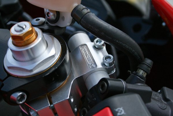 Számos olyan apróság van, melyektől gyorsabbak nem leszünk, viszont elengedhetetlenek egy versenymotoron. Ilyenek a felhajló fékkarok: nem törnek el, ha eldől a motor. Aki látta pár hete onboardon Valentino Rossit Donington Parkban elesni, az tudja, miről beszélek. Kellenek még fix, Arata márkájú lábtartók, amik szintén nem törnek le esésnél. Tudják, milyen rossz az, ha az ember lába a letörő konzol miatt beragad a csúszó motor alá? Ne feledkezzünk el a Vortex kormánycsutkákról sem. Ezekben az a jó, hogy a bilincsbe csúszó csövet külön lehet cserélni. Ha be van tárazva pár darab szár, egy rondább esés után akár tíz perc alatt újraépíthetjük a kormányt.
