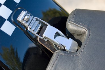 A hátsó rugós tag gáztartályos, Honda CB 900F-ről származik, ahogy a benzintank is – igaz, azt sokáig formázta Szakál, míg a mostani állapotát elnyerte. Érdekessége, hogy két szorítócsatja nem valami drága veteránalkatrész, síbakancsról származnak. A kézzel készített, szárnyas Art Deco Motorcycling embléma gyönyörűen mutat a kockás csíkkal aljasított tartályon. A felnik cseh jawásak, a fékek eredetiek. Az angol Lucas pedál miatt a hátsó dob tolóbowdenesre változott, de hatásfokán ez a trükk nem változtatott: nem bíznám rá az életemet.
