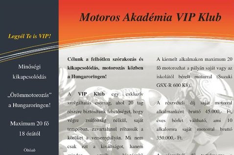 Pályanaponként 45.000 forintot kell fizetnie annak, aki a Motoros Akadémia V.I.P estéjén akar motorozni. A 2010-es szezonban tíz naptári napot jelöltek ki, melyeken 18-20 óráig nyitják meg a boxutcát az érdeklődőknek. Minden alkalomra maximum húsz ember regisztrálhat; aki az összes alkalomra egy összegben teszi le a pénzt, 350.000 forintos kedvezményes áron juthat hozzá a csomaghoz.