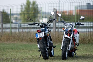 A Suzuki szerényebb: fekete váz, fekete idomok, a központi rugóstag helyett klasszikus pár: a dirt track ízbe keveredik a hetvenes évek scrambler hangulata. A sok műanyag helyett itt minden fém: a részletek kidolgozása gyönyörű, a DR250-ből származó blokk formája passzol a hagyományos vázhoz.