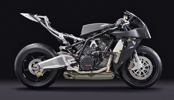 A második feladat tehát kreált egy újabb problémát: dupla falú, hőszigetelt dobot kell gyártani. Nézzünk egy konkrét példát: a KTM RC8R az európai gyártó 2008-ban megjelent RC8-as superbike-jának kicsit vadabb, de szintén Euro3-as utcai változata. Teljesítménye 168 lóerő 10250-as fordulaton, a kompresszió 13,5:1-hez. El tudjuk képzelni, hogy milyen terhelést ad a dobnak a két, majdnem 600 cm3-es henger, ekkora kompresszióviszonnyal, nagy égési csúcsnyomással? Alacsony fordulaton erős kisfrekvenciás, lüktetésszerű erőhatások érik a teljes dob belsejét, magasabb fordulaton ez magasabb frekvenciára vált és hozzájön a nem elhanyagolható nyomásérték, ami a dob fojtása miatt alakul ki. Nyilván ezt a dobot csak a motorblokk alá tehették, mert hová fért volna el egy több mint 15 liter bruttó térfogatú, több, mint 10 kg-os (!) dulpa, egyes helyeken tripla falú, rozsdamentes acélból készült, belül háromkamrás, négy belsőcsöves monstrum?