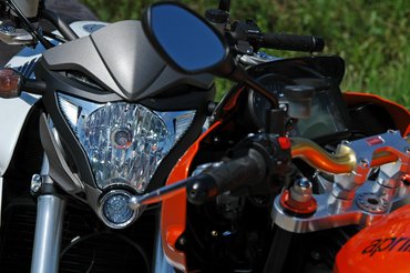 Winklert a közös motorozáskor rovarfejre emlékeztette a lámpaidom, engem gázálarcos droidra. Az LCD műszer is ügyes parasztvakítás, igazából viszont nem jó: napsütésben alig látni a számokat. A tank és az ülés keskenyedő vonala viszont valós dinamizmust sugall – nem hazugság, a 126 lóerős, vízhűtéses négyhengeres meglódítja a 222 kilót. Ismét egy kellemes érzéki csalódás: sokkal nehezebb, mint elsőre hinnénk.