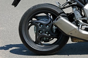 A japánok ügyes trükkel álcázták a kusza részleteket. Amit nem szerettek volna kihangsúlyozni, azt feketére fújták, a maradék csillog, fényes és vonzza a tekintetet. Jobboldalt a szálcsiszolt felületű kipufogó mindent ural; tudjuk, hogy az egész az Euro3 norma miatt van, de a méret adta kényszert egészen jól kibekkelték.