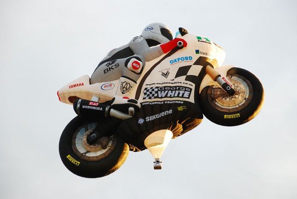 Elkészült a világ legnagyobb motorkerékpárja – a George White Superbikes által megrendelt eszköz gázhajtású, köbcenti és méret tekintetében egyaránt páratlan. Szerencse, hogy közúti forgalomban nem vehet részt, a léggömbök kifejezetten esetlenek aszfalton.