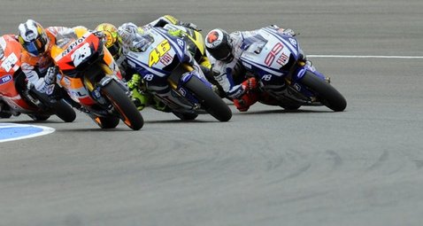 Pedrosa fordult el elsőnek a célegyenes végén, amin túl sokat nem kell csodálkozni, mert a spanyol akkor is rendszeresen megjátssza ezt a ziccert, ha a harmadik sorból indul – a pole-ból egy teljes mezőnyt lerajtolni kötelesség, ha Daniel Pedrosa a neved. Nagyot akart ma menni Valentino Rossi is, nem véletlenül ügyeskedett már az első féktávon: második helyre dobbantott rögtön, miután centiméterekre suhant el csapattársa, Lorenzo mellett.