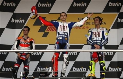 Az első két kísérletet még hárítani tudta a testharcban nem túl erős Pedrosa, de harmadszorra már nem hagyott esélyt Lorenzo. Fura, de Jorge menetelésétől Rossiba is visszaszállt a lélek: ha van még egy köre, ő is megeszi a hondást. Nicky Hayden ismét negyedik, ami kiváló: most már versenyben, fair körülmények között verte meg Stonert, aki nagyon rég volt már ennyire hátul az összetettben: két verseny után mindössze a nyolcadik, a ma szerzett tizenegy pontjával. Jorge Lornezo viszont átvette a vezetést: neki jelenleg negyvenöt egysége van Rossi negyvenegyével szemben, aki második. Harmadik Pedrosa huszonkilenc ponttal.