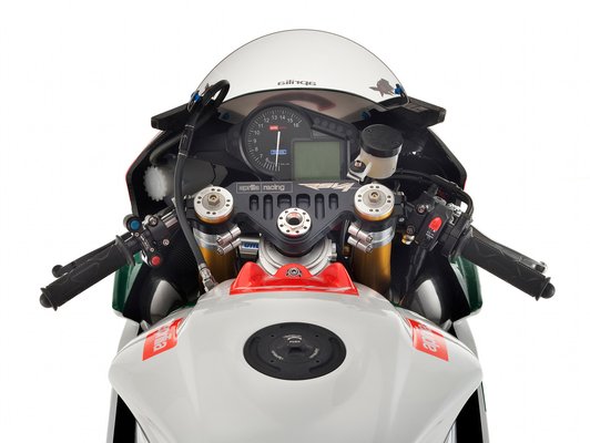 A burkolat teljes egészben karbon, de kompozit technikával készültek a V4-es blokk védői és a hátsó ülésnyúlvány is. A lábtartók, a kormány és a programozható elektronika szintén nem az, amit a szérián megismertünk.